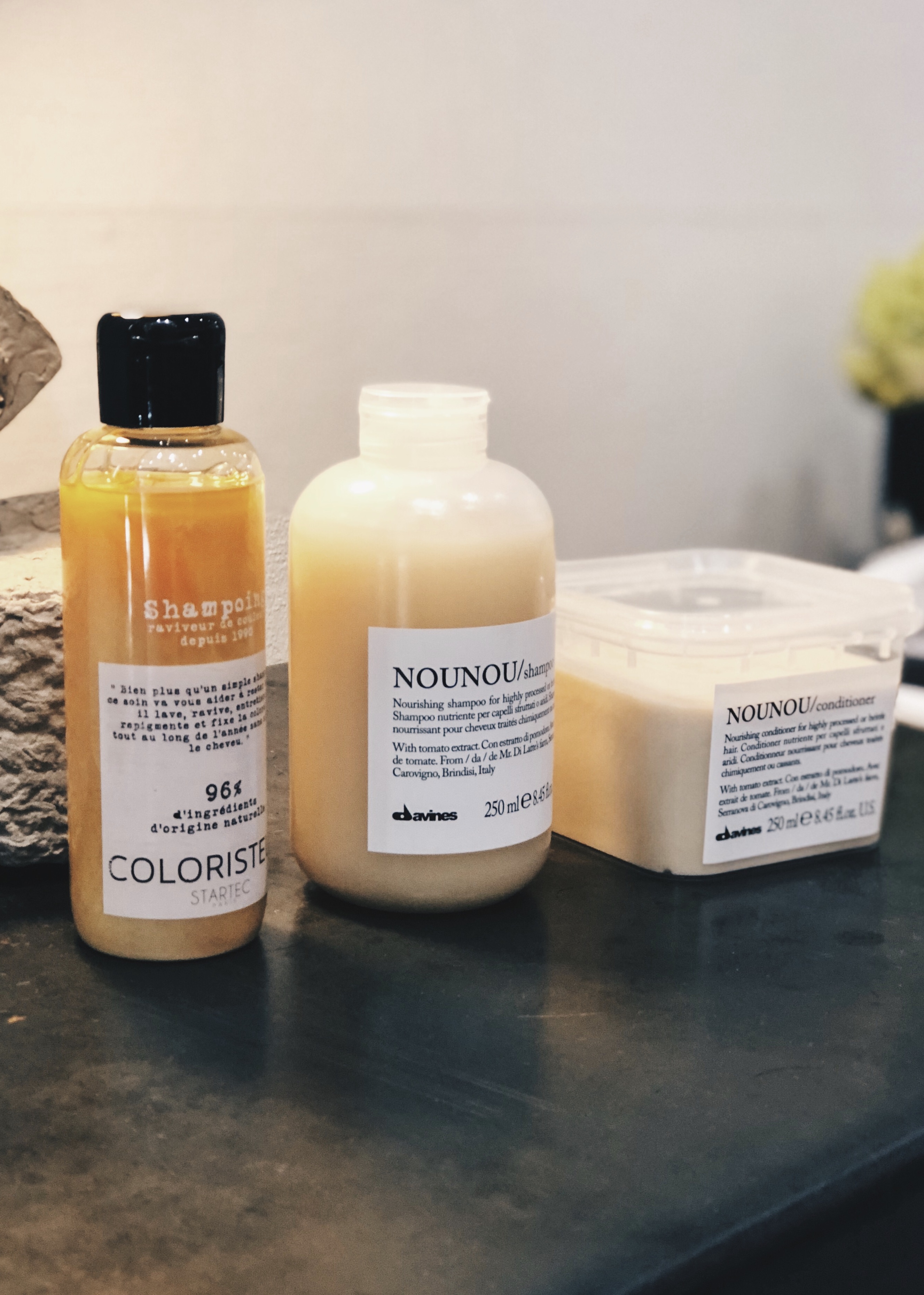 Elodie washed my hair twice! For the first wash she used a natural (yay!) shampoo for damaged hair from NouNou. She then followed up with a color- and shine-enhancing shampoo containing shea butter and vitamins to further nourish and strengthen the hair. Finally she applied the NouNou conditioner and massaged my strands and scalp. It was all so luxurious and relaxing!