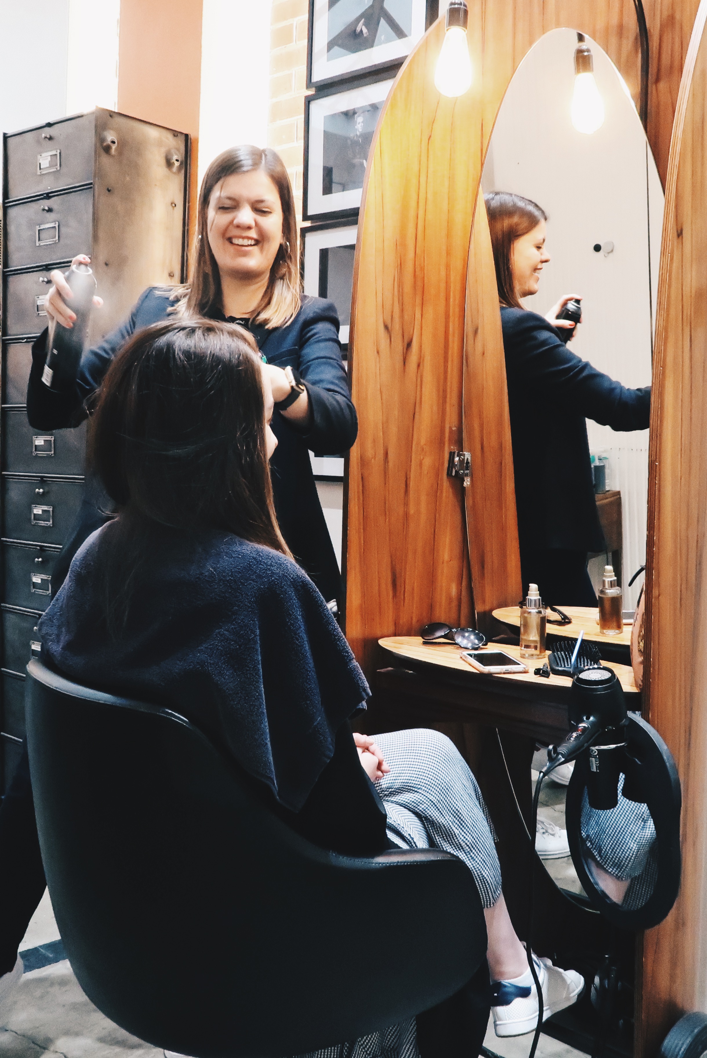 After blowdrying, Elodie used a straightener to enhance the shine. At Medley they use the best styling tools and brushes available. I was so excited to see Elodie using GHD, as they are one of my favorite brands, and I recently purchased a straightener and travel hairdryer from them! After straightening, Elodie really took the time to style my hair. She switched up my part, played around with different positions, and finished it all off with a bit of hairspray. She also gave me so many tips that I will be sharing later in a future post. 🙂